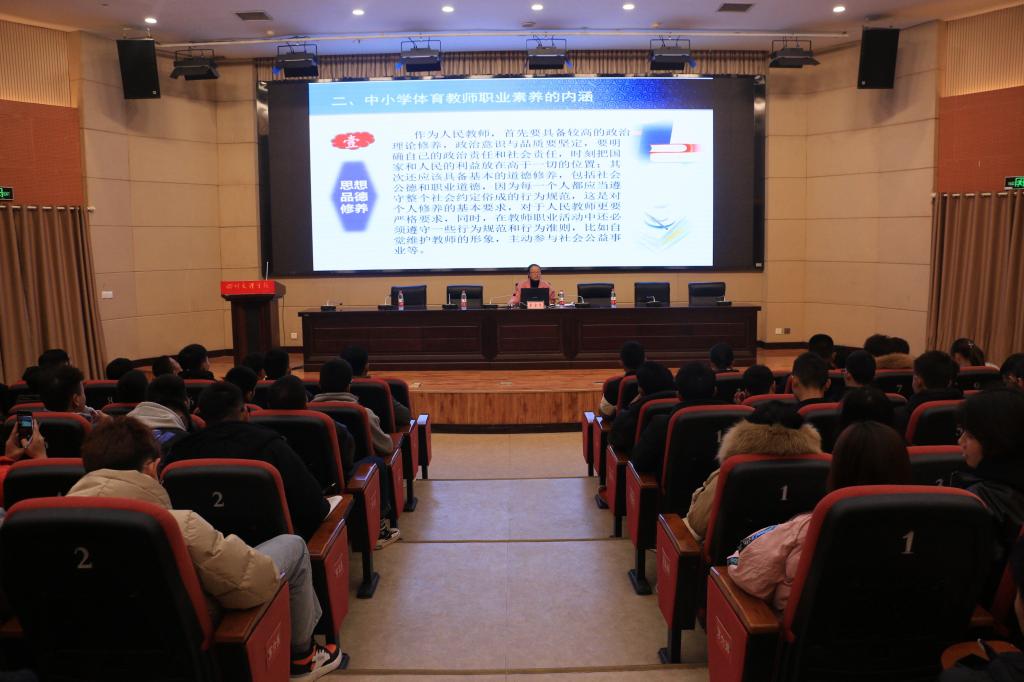 202011221900,永利集团304官网副教授覃雪芹在莲湖校区学术报告A厅作了关于《中小学体育教师的职业素养养成》的学术讲座。体育公司党总支书记王兆忠、经理佘涛、党总支副书记彭波、教学科研办主任李进文、科研秘书黄亮及永利集团304官网师生三百余人参加了此次讲座。讲座由副经理孙亮亮主持。