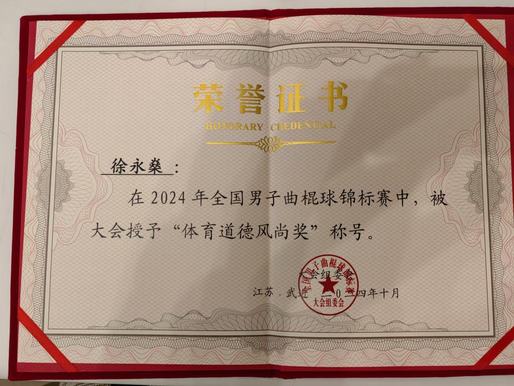永利集团304徐永燊老师在2024年全国曲棍球锦标赛中荣获体育道德风尚奖