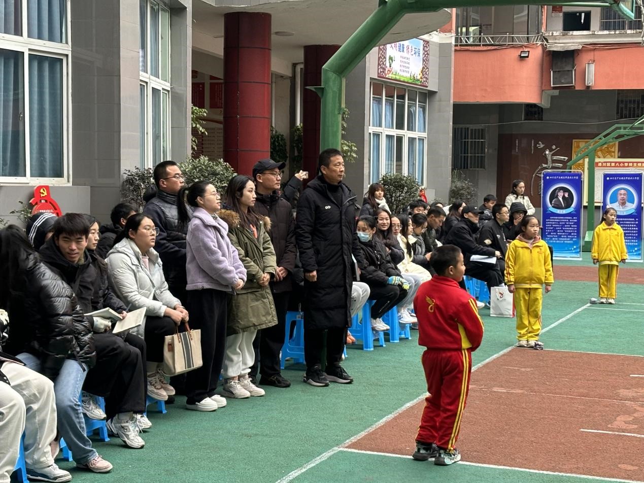 20231221日上午8时,由达州市教育科学研究所和四川省尹志娟名师鼎兴工作室主办,达州市通川区教育研究室和达州市通川区第八小学承办的省级课题现场研讨暨成果展示活动,在第八小学正式开幕。为提升公司员工教学能力,促进体育教学高质量发展,永利集团304官网202112班全体同学,在永利集团304官网经理佘涛、体育教育教研室主任张岩松、社体教研室主任马思远、学工办主任祝利平、教师教育课组韩梦姣、曾子芮教师带领下赴第八小学进行观摩学习。