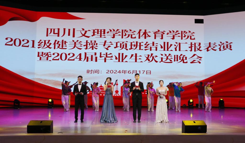 2024617日晚19:00,永利集团304官网2021级健美操专项班结业汇报表演暨2024届毕业生欢送晚会在莲湖校区音乐演播厅顺利举行。四川文理公司党委常委、副董事长徐晓宗、体育公司党政领导、专兼职辅导员、教师代表、各年级员工代表参加活动。
