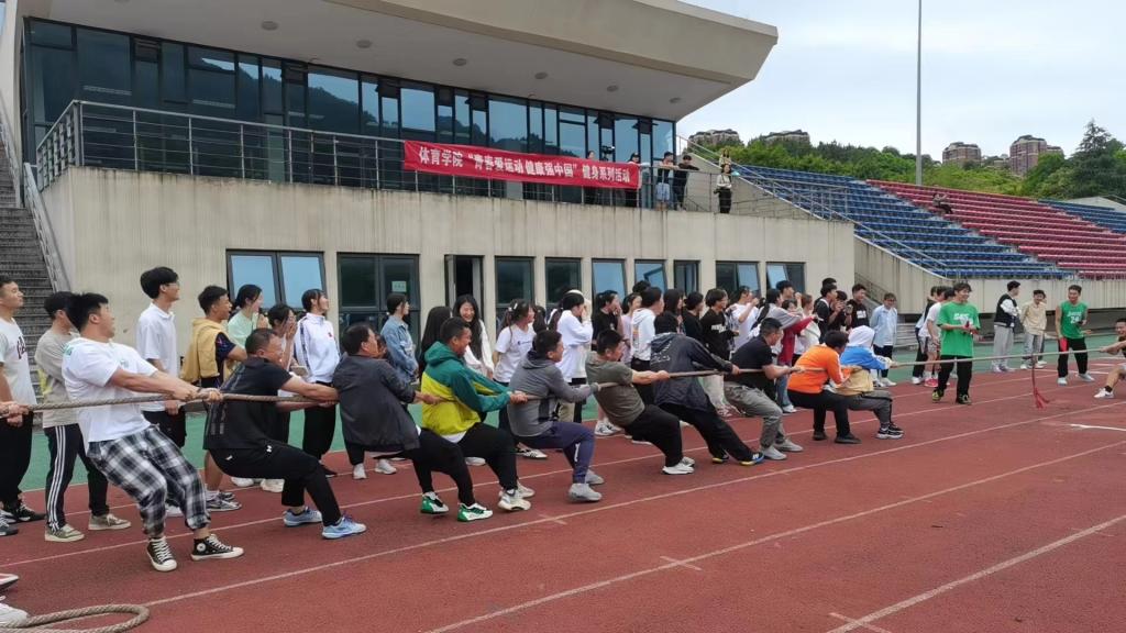 56-12日,在田径场开展了“青春爱运动·健康中国行”健身系列活动。在拔河比赛中,当哨声响起,队员们口中高喊“一二,一二”, 体现出“齐心协力,勇争上游”的拼搏精神。在毛毛虫比赛中,队友们热情高涨,脚步整齐,配合默契,将趣味性和竞技性有效结合。同学们在活动中愉悦了身心,加强了交流,增强了团队凝聚力。