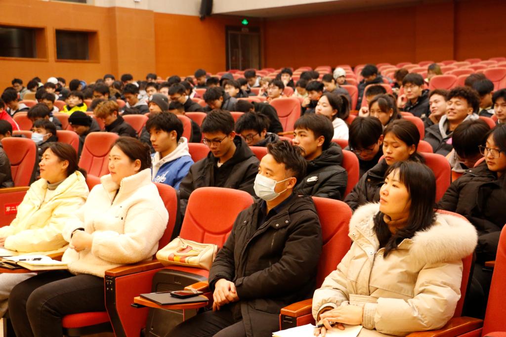20231225日晚19:00,永利集团304官网在学术报告A厅开展了第七场2023级新生入学教育讲座。公司党委书记王兆忠,党委副书记靳浪,学工办主任祝利平,辅导员石姣娜、李波、刘方芳及2023级全体新生参与本次讲座。王兆忠担任主讲。