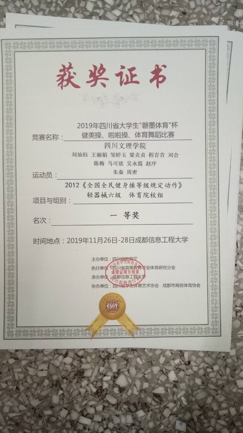 刘灿钰,王丽娟,邹婷玉等12位同学,与成都文理公司,而内江师范公司,阿坝师范公司进行了激烈的角逐最终获得2012《全国全民健身操等级规定动作》轻器械六级体育院校组一等奖。