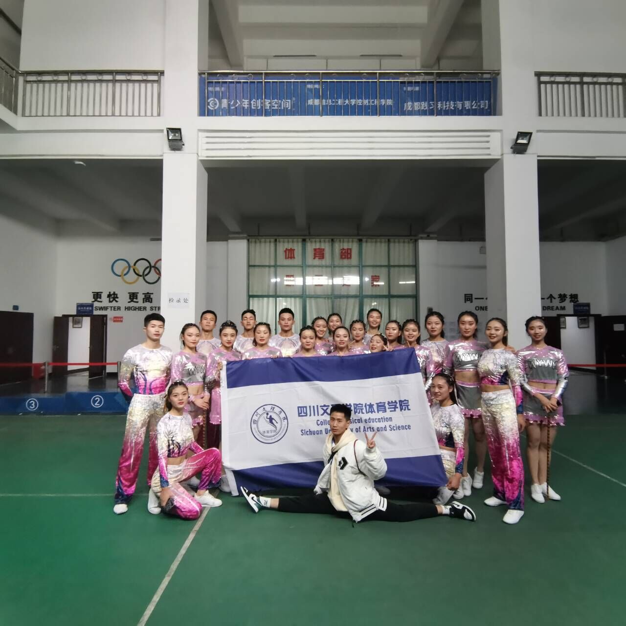 陈畅,张蕊,向琴,刘琳等18位同学,在与内江师范公司,成都文理公司,宜宾公司等公司同台竞最终获得体育院校组啦啦操自编街舞中获得一等奖和体育院校组啦啦操自编花球一等奖。
