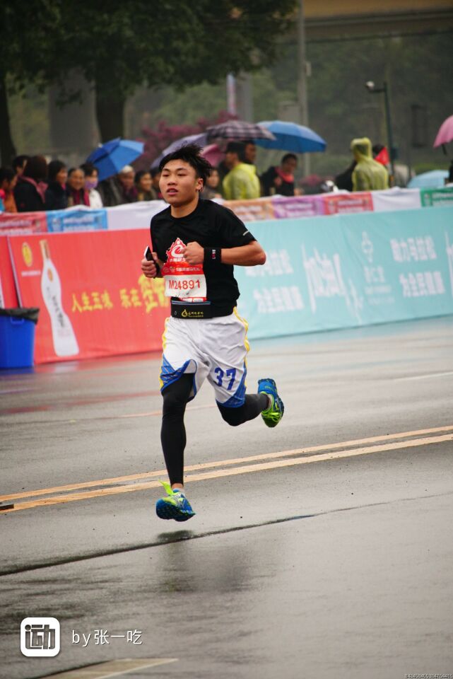 说实话,我对于这次马拉松并没有多大信心,因为毕竟高手太多了。但是在我到达第十四公里的时候,赛道旁边的摄影师提醒我在我前面有81个人,这下我有了自信。距离终点还有七公里,我不敢贸然加速,只得调整好呼吸,一步一步的向那个叫做终点的地方前进。五公里过后,在我前面的选手还有五十多个,还有最后两公里的时候,我的右小腿突然急剧地抽搐了一下。那感觉就像是有人用一根藤条狠狠地抽打着你的腿。瞬间我就反应过来了,这是抽筋的前兆!于是,我在一个十字路口处停了下来,这时,赛道两旁的志愿者都跑到我身边,向我提供帮助。当时我真的好想就此放弃,因为在我停下来的时候,右脚也有抽筋的迹象!但我最后还是不甘心,这是我人生中第一次参加马拉松,我不想在这最后两公里留下遗憾,那怕是走,也要完成这场马拉松!在原地休息了两三分钟后,我还是决定要坚持完成比赛。当时我已经做好走完最后两公里的准备了,没有人知道最后那两公里我是怎样完成的,除了我自己。那时天空下起了大雨,身上没有一处是干的,双腿抽筋,我在雨中缓慢前进。十二分钟后,我终于到达了终点。在接过完赛奖牌后,我抬头望着天空,雨水和着泪水从我脸颊慢慢向下滑落。那一刻,我感觉整个世界都静止了,脑袋里全是最后两公里的场景,我觉得最后两公里跑得比前面十九公里都要漫长,都要累。